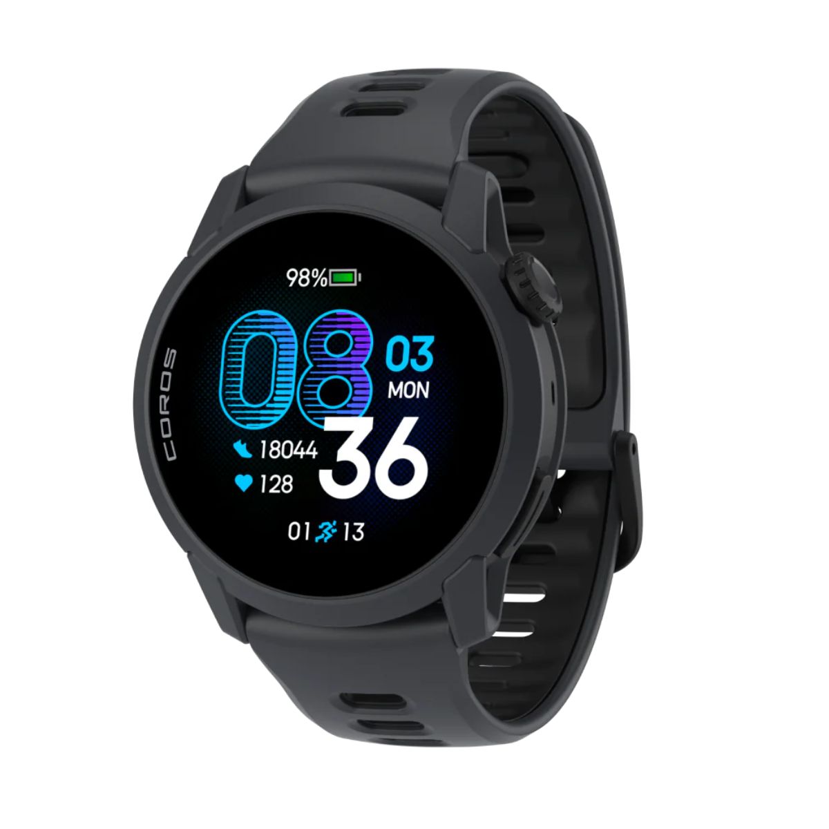 Nizkoprofilno, dvobarvno ohišje, ki ostane trdno na zapestju, nadgrajuje prilagodljiv, enostavno nastavljiv silikonski pašček.
